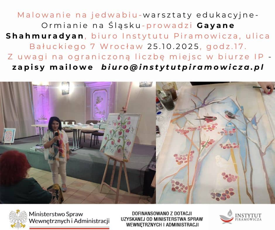 Malowanie na jedwabiu- warsztaty edukacyjne- Ormianie na Śląsku- prowadzi Gayane Shahmuradyan, biuro Instytutu Piramowicza, ulica Bałuckiego 7 Wrocław 25.10.2025, godz.17.
